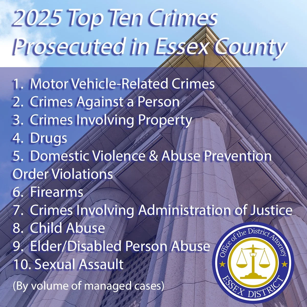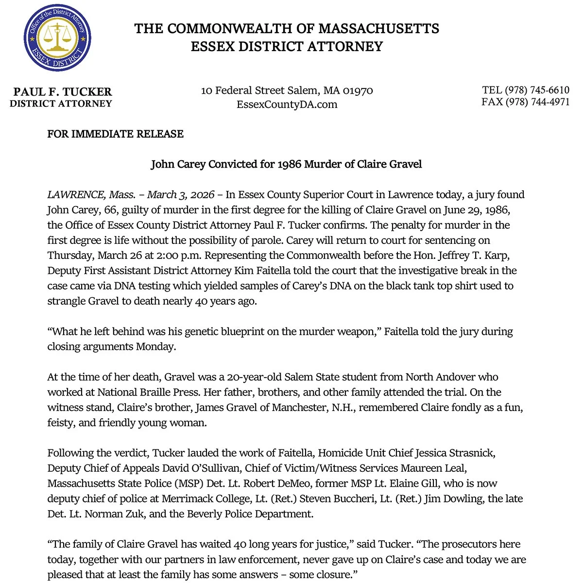 District Attorney Paul F. Tucker leads a team of legal, victim/witness, juvenile justice, and support personnel, serving Essex County’s 34 cities and towns.