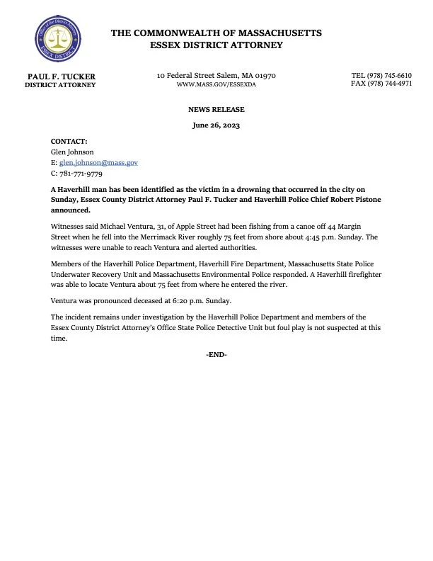 Members of the Haverhill Police Department, Haverhill Fire Department, Massachusetts State Police Underwater Recovery Unit and Massachusetts Environmental Police responded. A Haverhill firefighter was able to locate Ventura about 75 feet from where he entered the river.