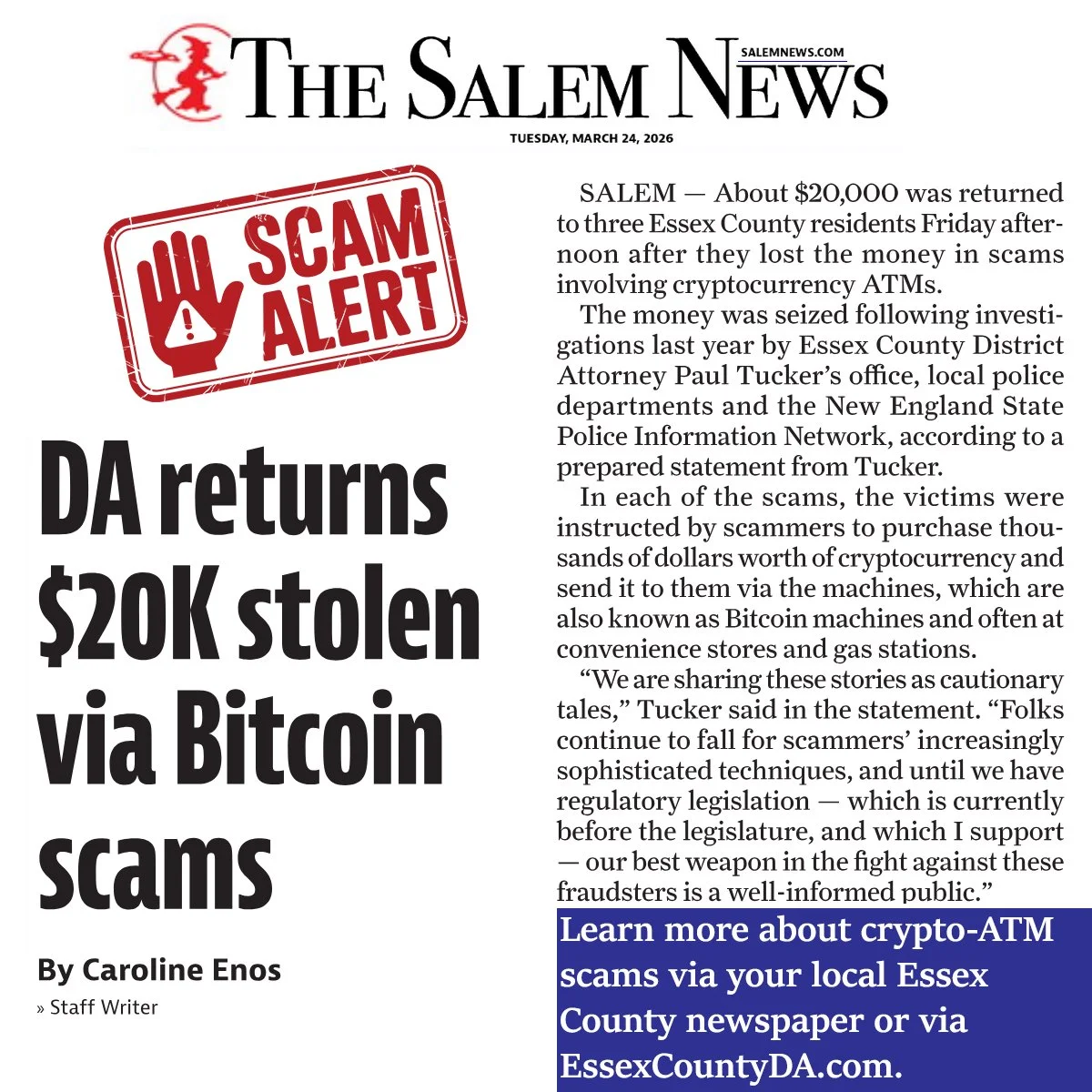The investigation continues and any other victims of this defendant are encouraged to contact the Essex County District Attorney’s Office at 978-744-6610, extension 5004, or the Massachusetts State Police.