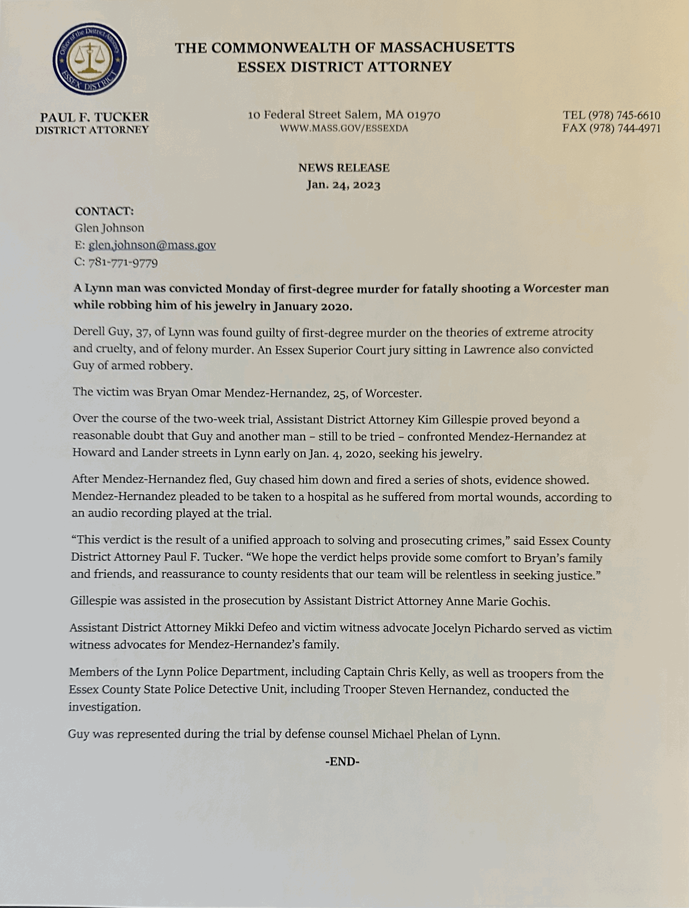 Derell Guy, 37, of Lynn was found guilty of first-degree murder on the theories of extreme atrocity and cruelty, and of felony murder. An Essex Superior Court jury sitting in Lawrence also convicted Guy of armed robbery.