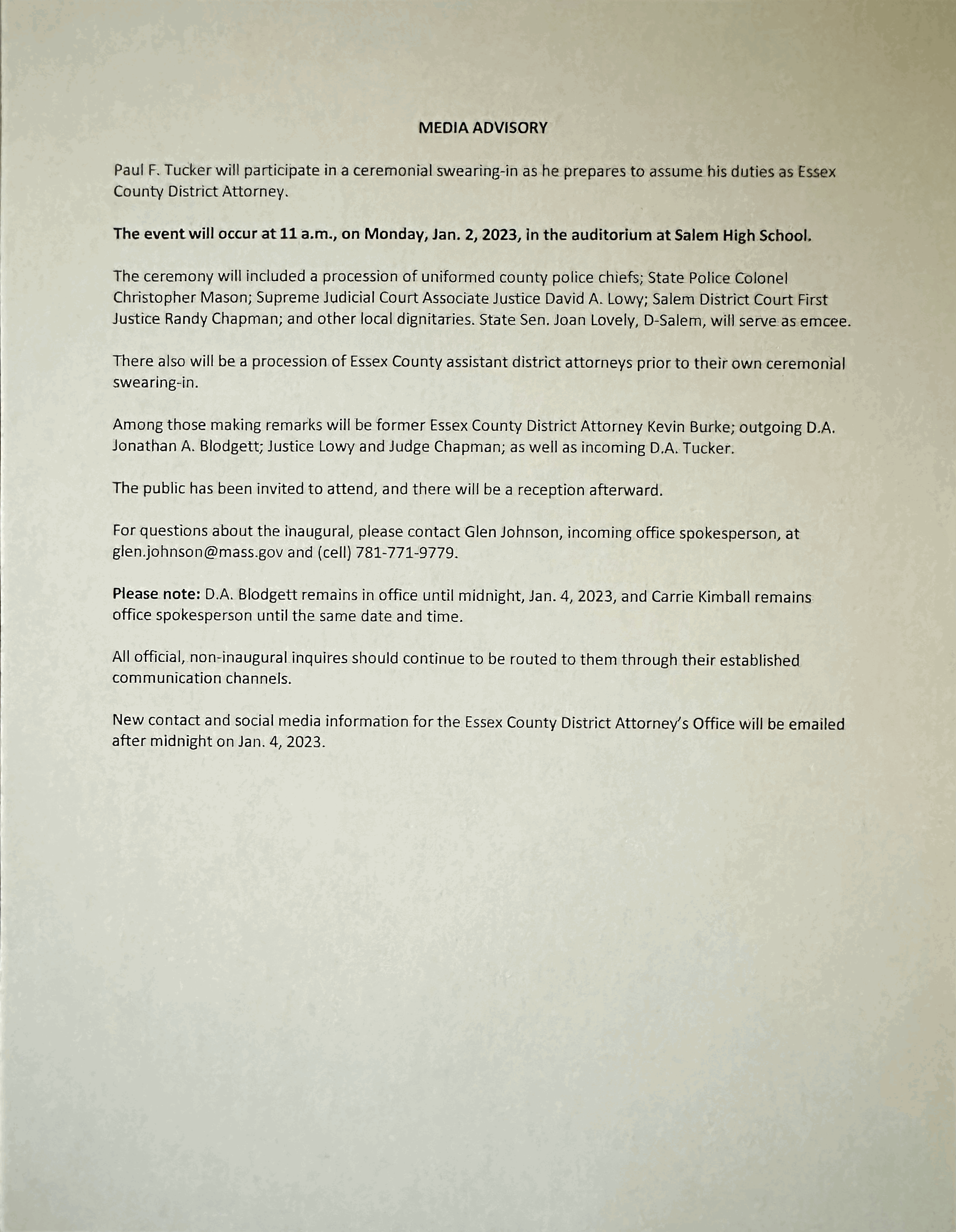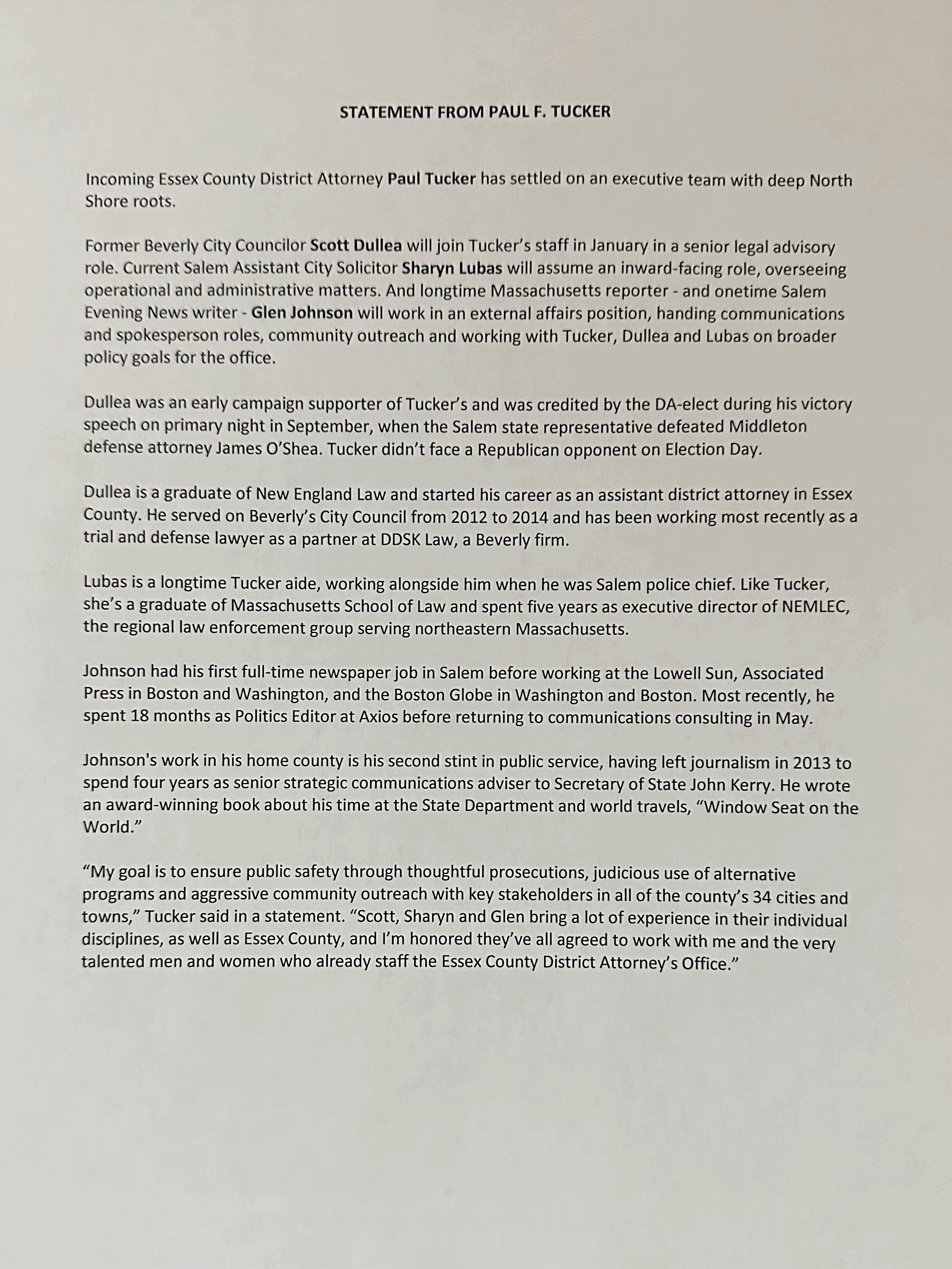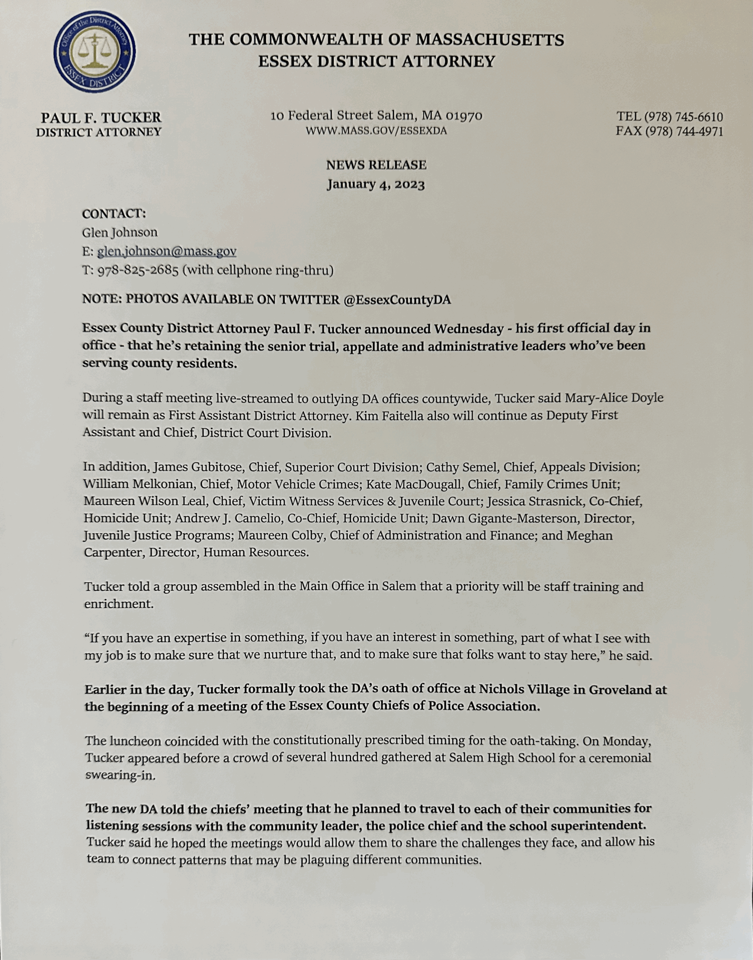 Essex County District Attorney Paul F. Tucker announced Wednesday - his first official day in office - that he’s retaining the senior trial, appellate and administrative leaders who have been serving county residents.