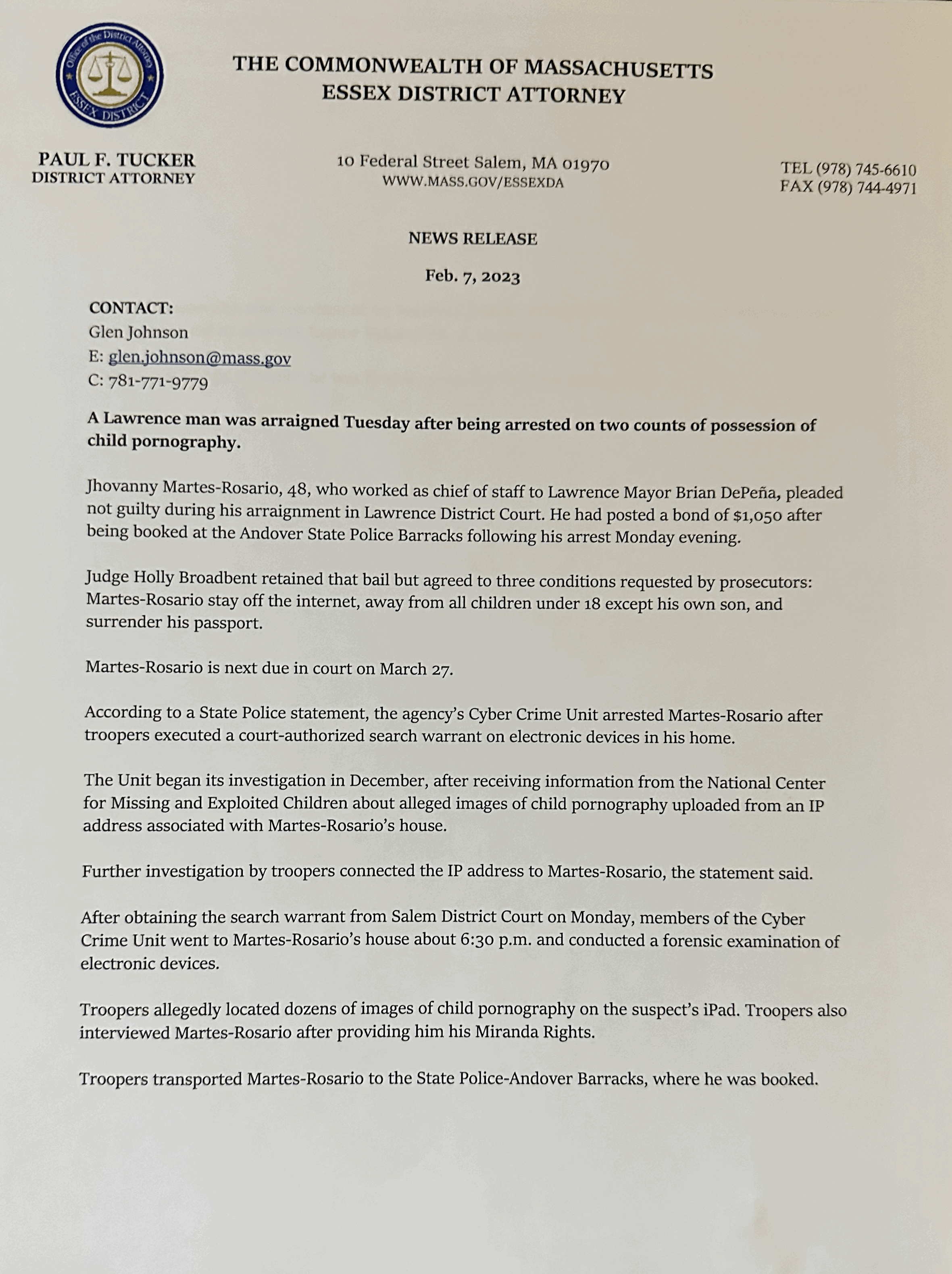 Jhovanny Martes-Rosario, 48, who worked as chief of staff to Lawrence Mayor Brian DePeña, pleaded not guilty during his arraignment in Lawrence District Court. He had posted a bond of $1,050 after being booked at the Andover State Police Barracks following his arrest Monday evening.
