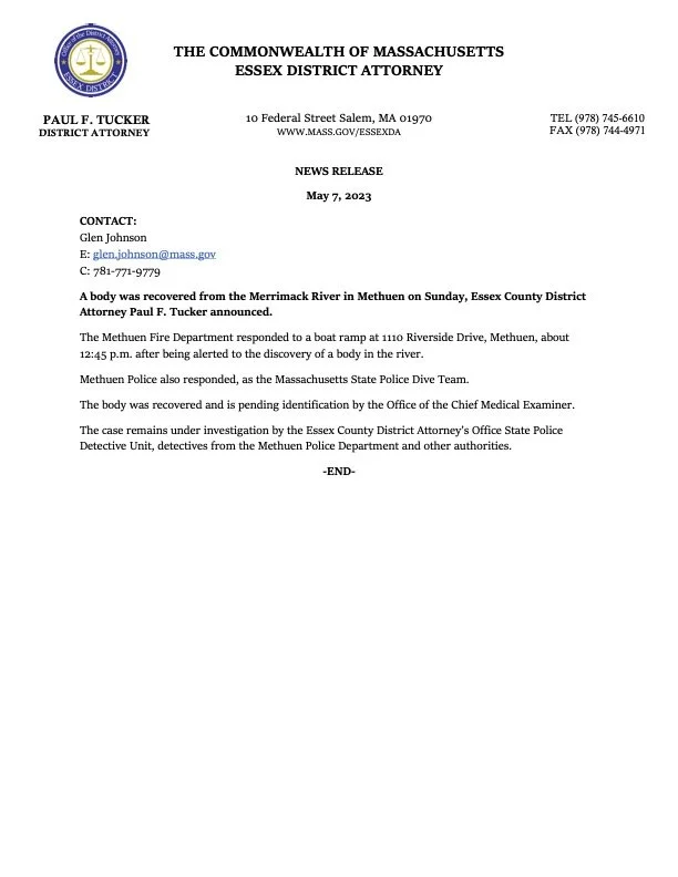 The Methuen Fire Department responded to a boat ramp after being alerted to the discovery of a body in the river